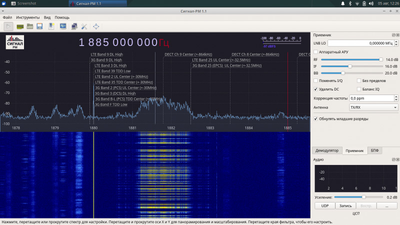 Ориентацию в радиоэфире упрощает предустановленная база, в которой свыше 1200 частот основных стандартов: 5G, LTE, 3G, GSM, WAVE, DECT, LPD, Wi-Fi (2.4 ГГц, 3.6 ГГц и 5 ГГц), PMR, CB, GPS, GLONASS и пр. Анализ сигналов облегчает визуализация сигналов по диаграмме типа «водопад». Все получаемые данные можно сохранить в файл и работать затем с ними в более спокойной обстановке.