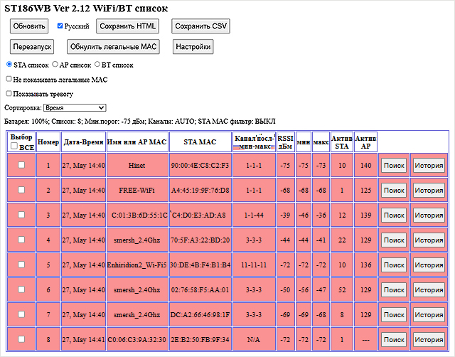 Поисковый анализатор Wi-Fi и Bluetooth устройств ST186WB – это профессиональный портативный прибор, предназначенный для обнаружения, мониторинга и локализации беспроводных устройств. Анализатор работает со стандартами Wi-Fi 802.11 a/b/g/n/ac/k/ и Bluetooth 5.0 и ниже, что позволяет охватывать практически все современные беспроводные технологии. Базовый приемный модуль ST186ПМ обеспечивает прием и обработку радиосигналов, создает собственную Wi-Fi сеть с фиксированным IP-адресом и передает данные в виде удобной веб-страницы на любое устройство с браузером – будь то смартфон, планшет или компьютер.