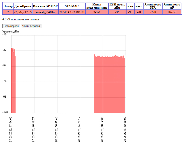 Режим "Поиск" - позволяет определить местоположение выбранной точки доступа (AP), клиента (STA) или Bluetooth-устройства. На экран выводится строка с параметрами устройства и графическим отображением уровня сигнала.