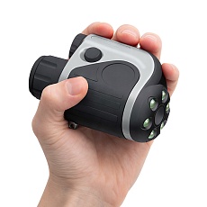- Обнаружитель видеокамер “Оптик-2” – выполнен в виде бинокуляра (бинокля) со светодиодной подсветкой зеленого цвета. При обнаружении прибором потайной камеры происходит яркая вспышка зеленого цвета. Дальность действия “Оптика” – от 2-х до 20-ти метров, угол выявления скрытых устройств ограничивается углом обзора видеокамеры. Позволяет обнаруживать профессионально установленные видеокамеры с использованием тонких решеток и диафрагм.
