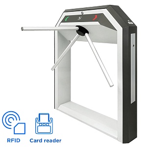 Универсальное и практически всепогодное устройство оснащено двумя электронными считывателями данных с карт. Полноростовая модель с калиткой обеспечивает достаточно высокую пропускную способность (20-35 человек за минуту), имеет блокировку обратного хода и разблокировку на случай аварии.